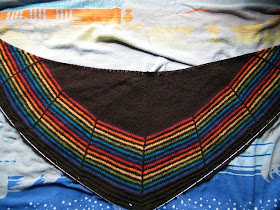 On the back, you have a wavy lace pattern, taken from the haapsaluu shawl book. The ribbing starts sooner then on the front, because the pattern repeat here was less rows then the front panel.